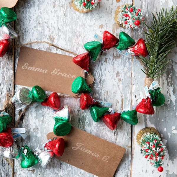 To create the napkin ring/name tag: String name tag through a pine needle stem. Bend stem into a circle and secure the two ends with twine. Place a small glue drop on the KISSES candies and stick on to stem all the way around, creating a candy ring.