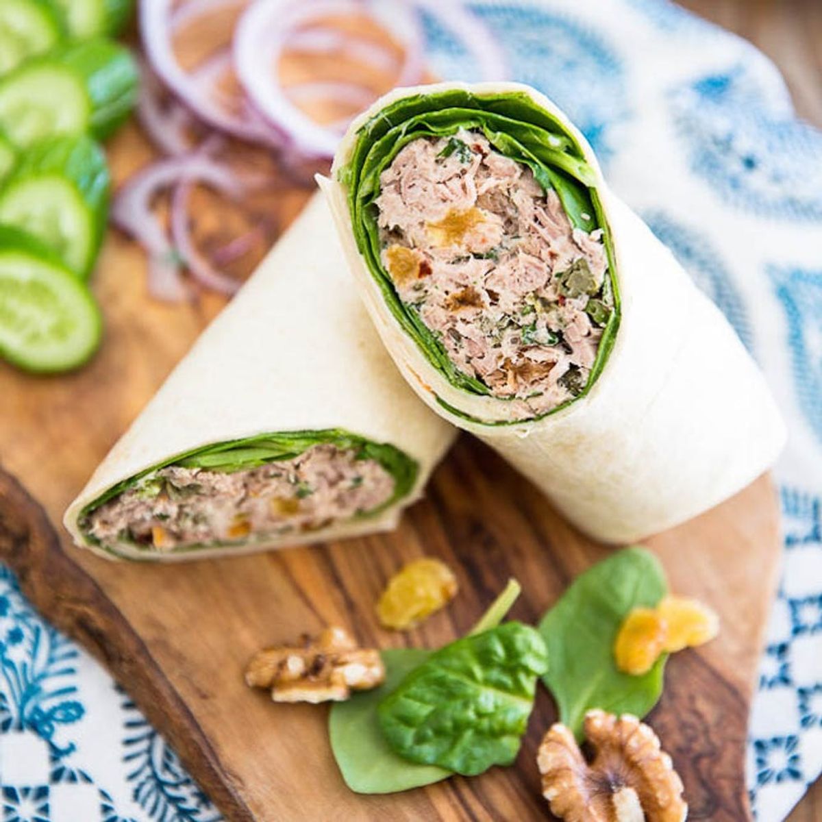 Walnuts, raisins, and capers give these tuna high-protein wraps a sweet n' salty vibe. If you don’t like mayo, try using Greek yogurt as your tuna salad binder instead, for added protein. (via The Healthy Foodie)