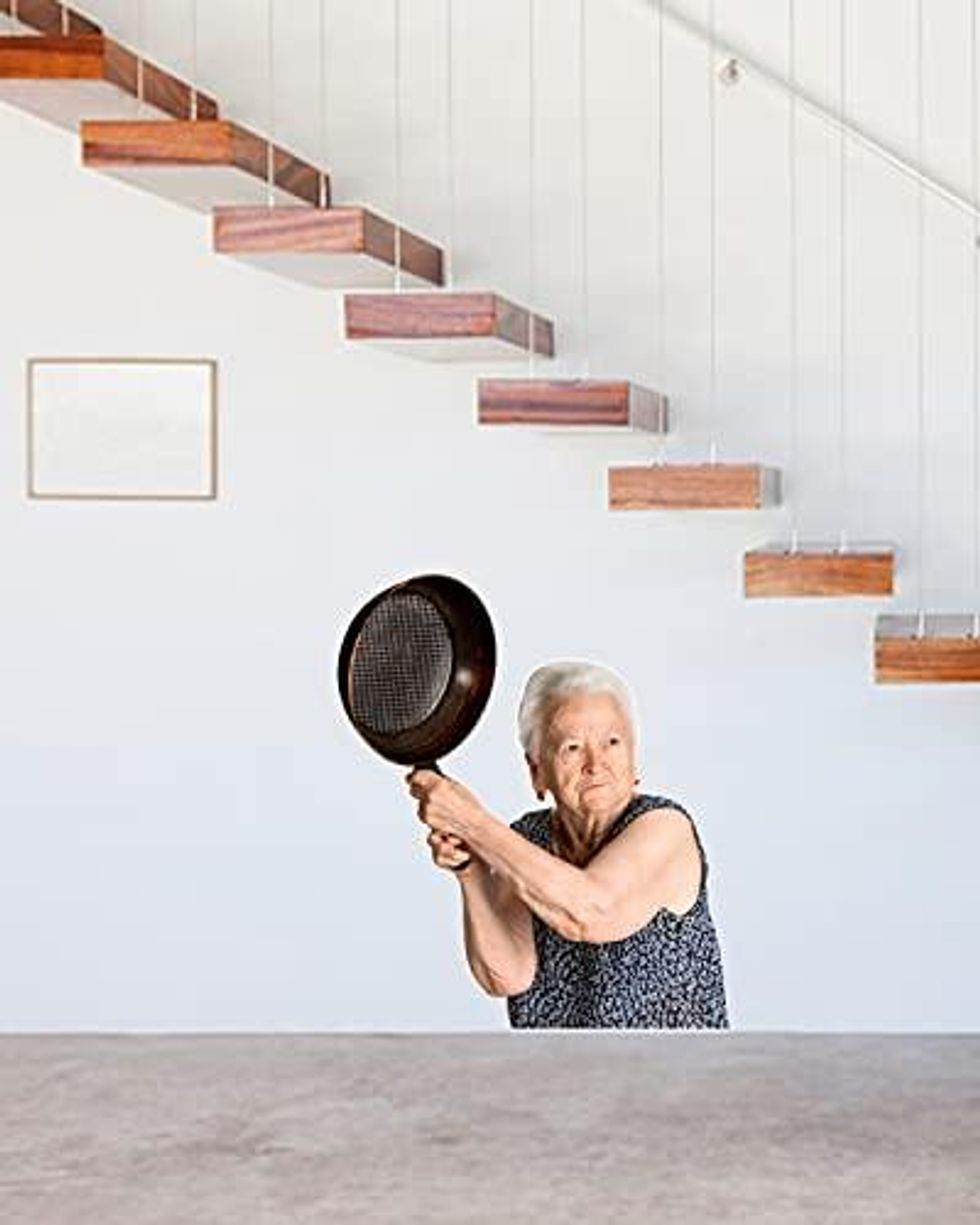 We are really not too sure in what circumstances you could ever need this peel-and-stick wall decal, but we will attempt to reason why here. This Old Lady with Frying Pan Wall Decal is quite lols and would work great in a dorm or apartment where sticking funny stuff on the walls could bring a smile to your face.