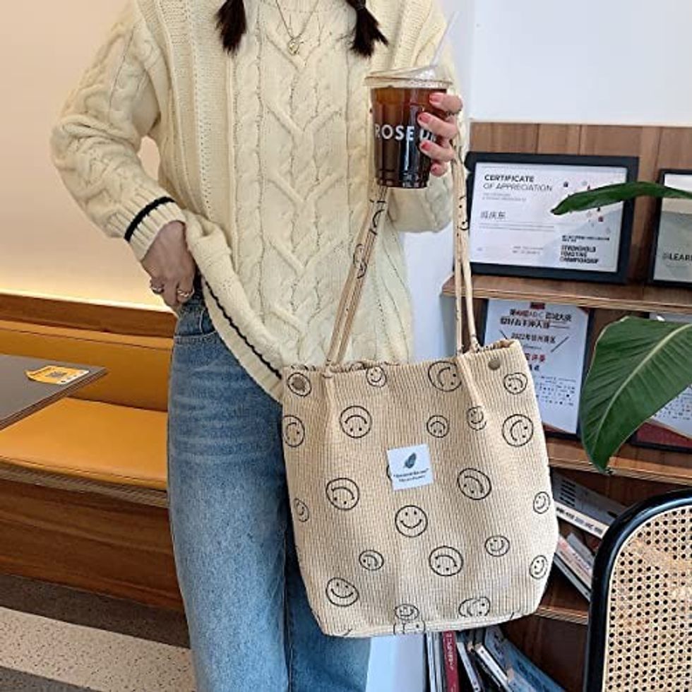 You might not consider corduroy to be a good material for a tote bag, but this one proves just how great it is. The smiley face bag is durable and spacious, making it a great buy for the EveryGirl in your life.
