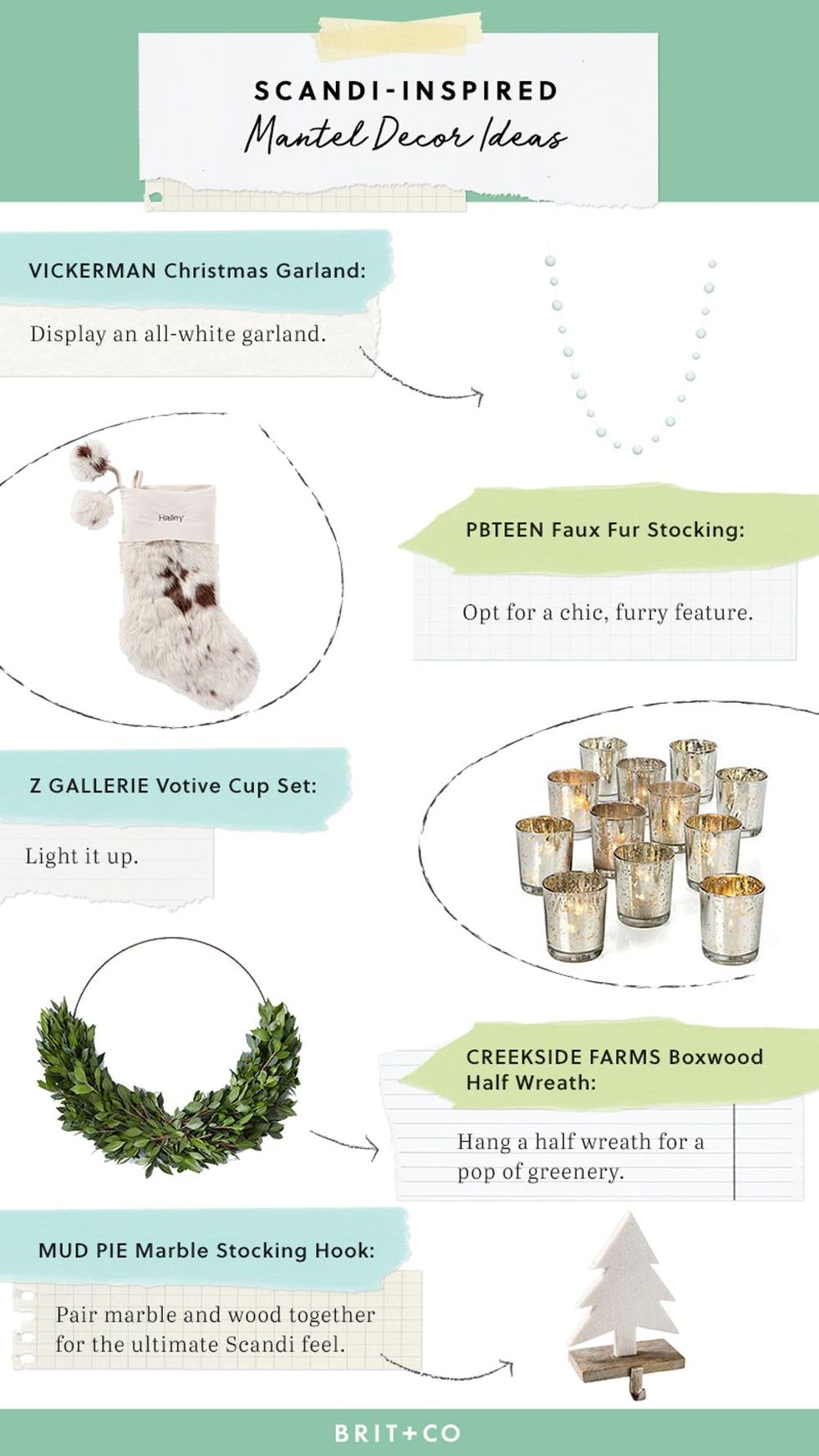 From top to bottom: Vickerman Christmas Garland ($10), PBteen Faux Fur Stocking ($20), Z Gallerie Votive Cup Set ($20), Creekside Farms Boxwood Half Wreath ($38), Mud Pie Marble Stocking Hook ($16)