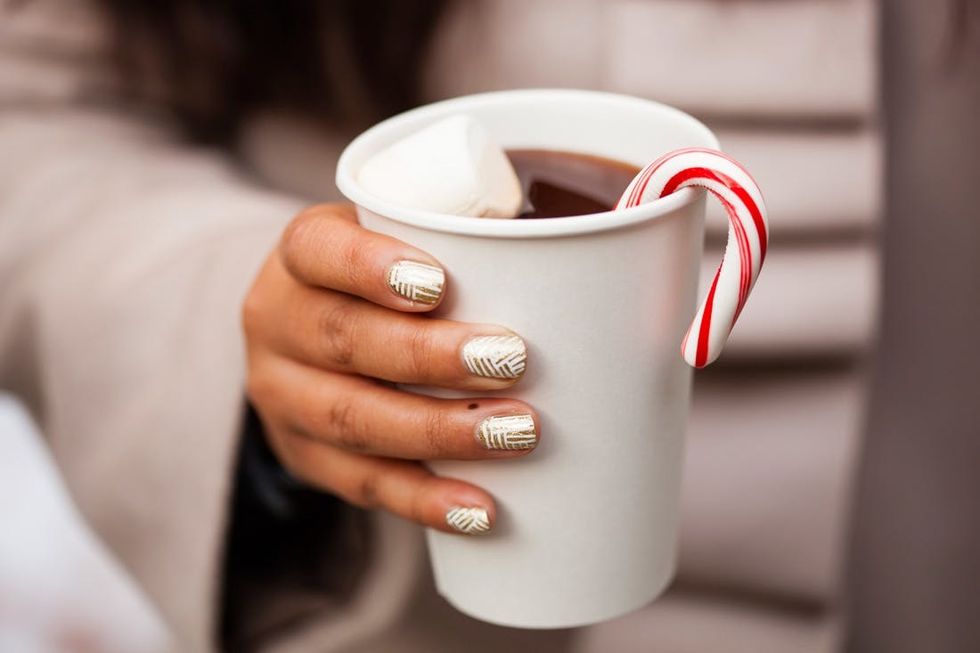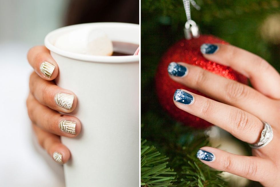 When it comes to holiday style, we here at Brit + Co. leave no stone unturned. How could we possibly serve up holiday nail art inspiration without getting on the action right here? We teamed up with TopCoat to deck out all the ladies in the office for our holiday party, and they were kind enough to share some of their new nail art tricks for this holiday season. Presenting one awesome geometric gold mani and our new favorite nail art concept ever: SNOMBRE! (Aka snow plus ombre — genius, right?!)
