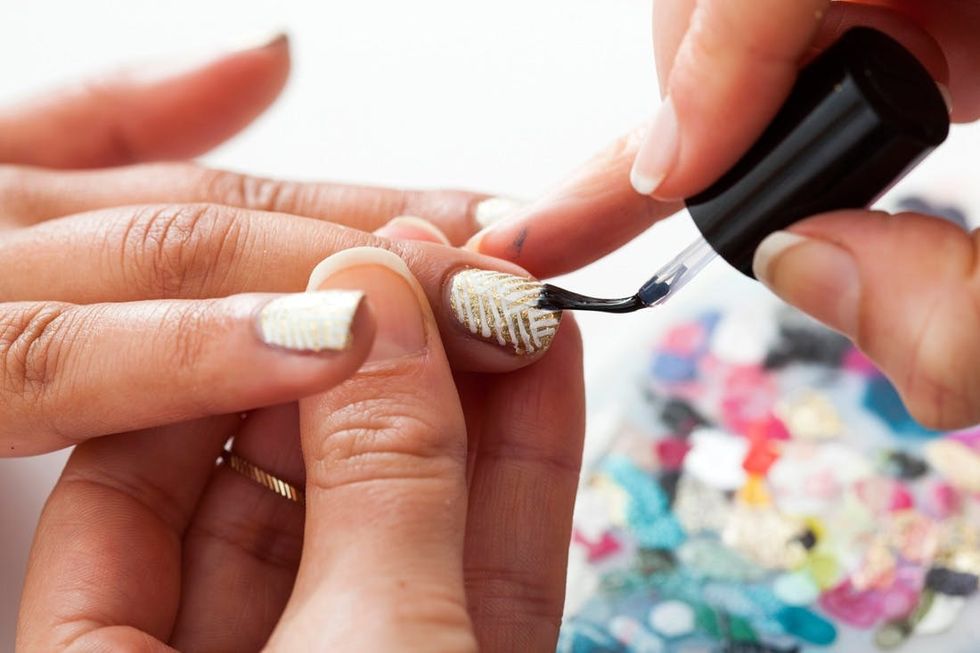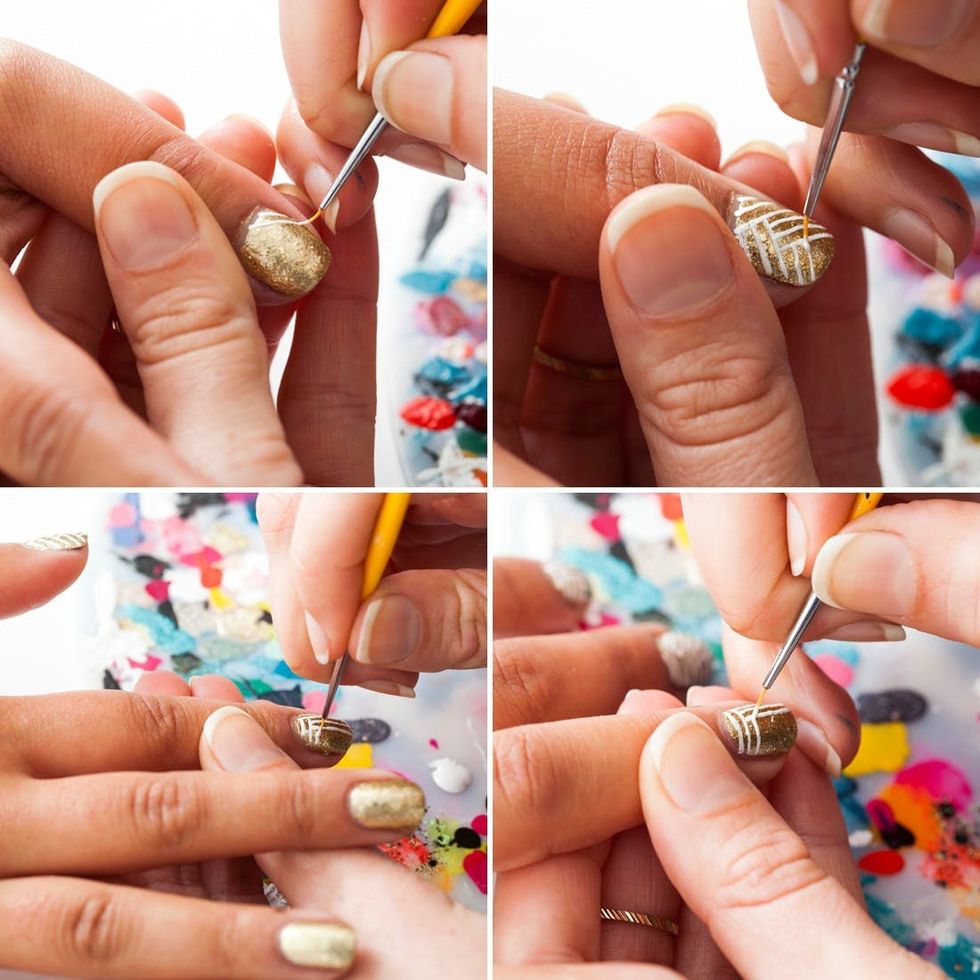 The key here is to use a separate nail art paintbrush that’s much thinner than the one that comes with your polish. Start by painting a base coat of gold. Then, get a super opaque white to create your design. A steady hand is definitely in order for this one! Paint stripes on the nail and create any pattern you like.