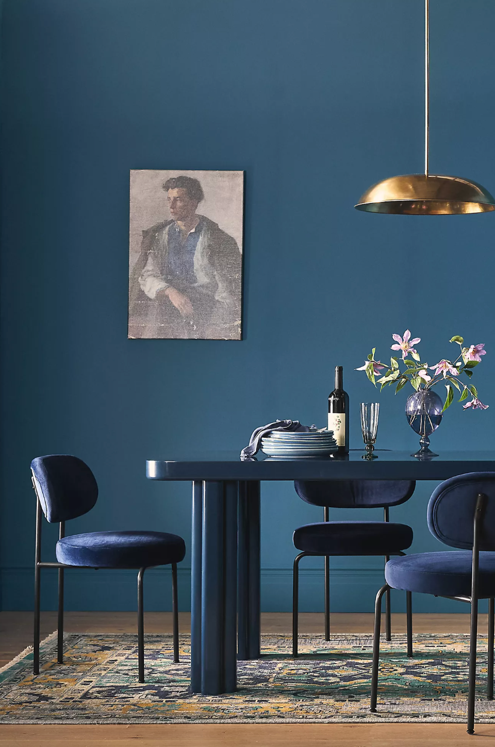 With warm colors dominating in recent years, dark moodier blues are creeping back in for us blue lovers. Trend forecaster WGSN's Color of the Year, Future Dusk, is moody with sense of mystery and escapism. It's like your dependable midnight blue, it manages to feel both familiar and futuristic, earthy and actually celestial, beautifully shown in this CB2 Cantar Blue Velvet Upholstered Queen Bed.