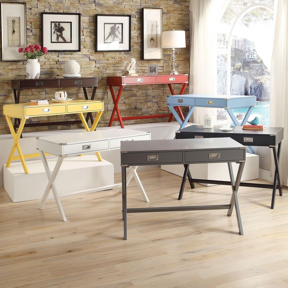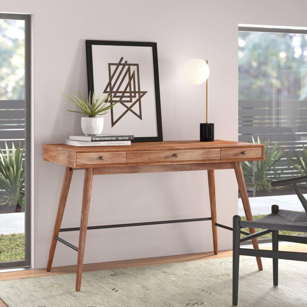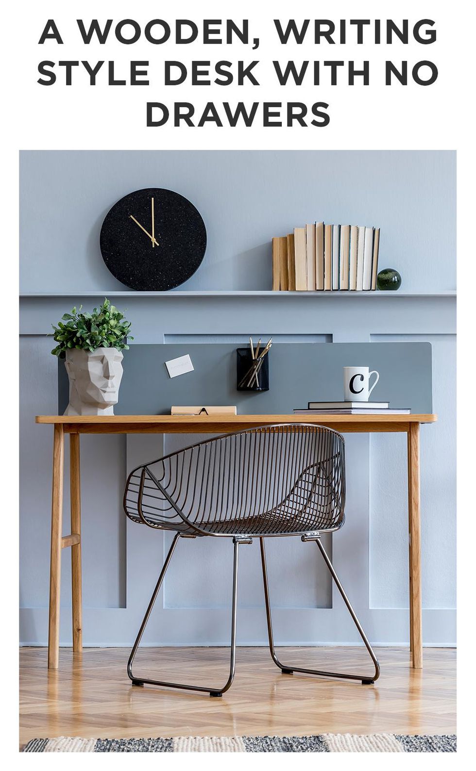Wood writing desks with minimal features, like no drawers, won out for the most common desks. Floating shelves provided elegant storage above.