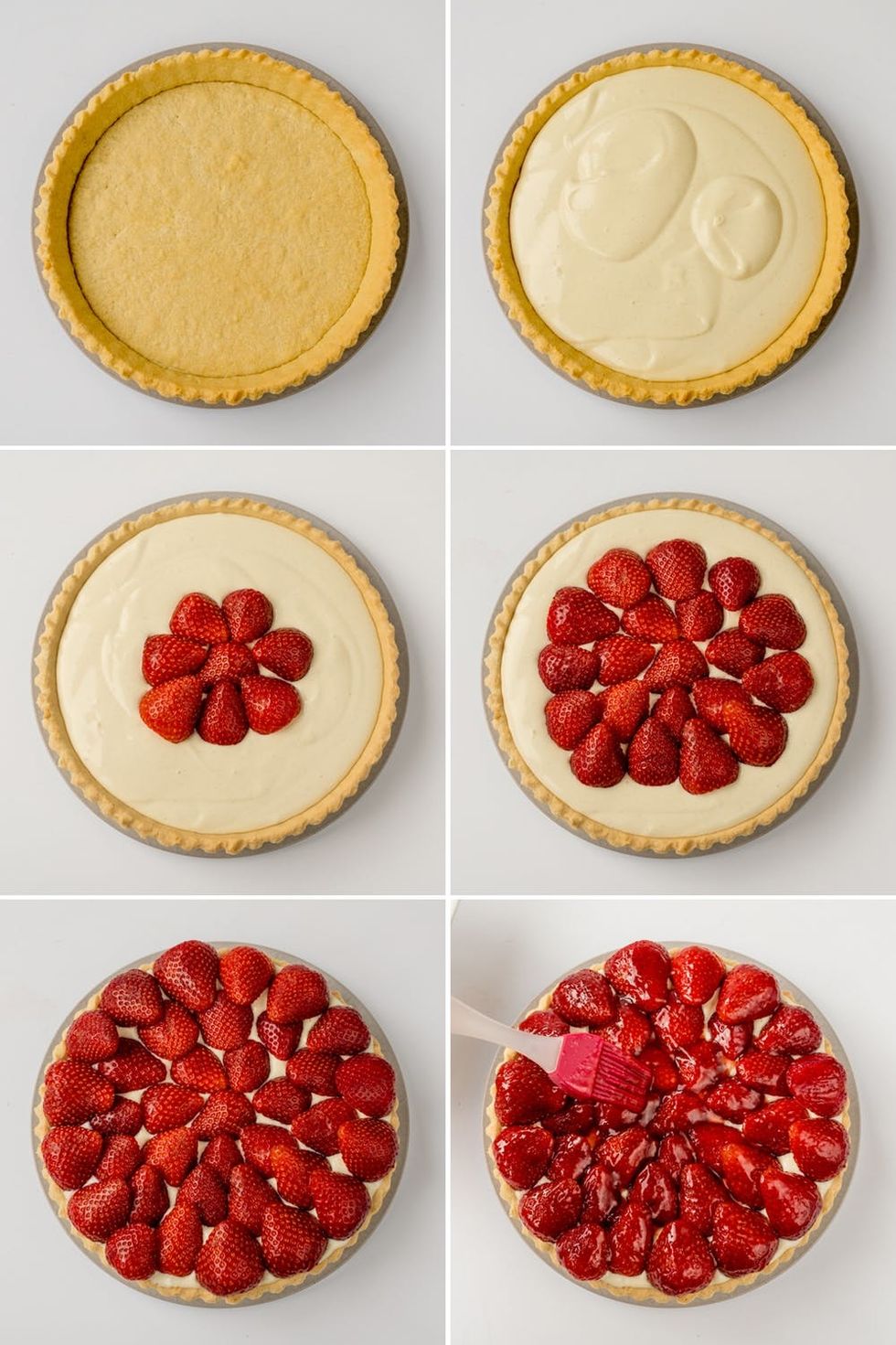 - Place a strawberry half in the middle of the tart and, working outward, arrange the strawberries in concentric circles, with the pointy bit of the strawberry toward the center.