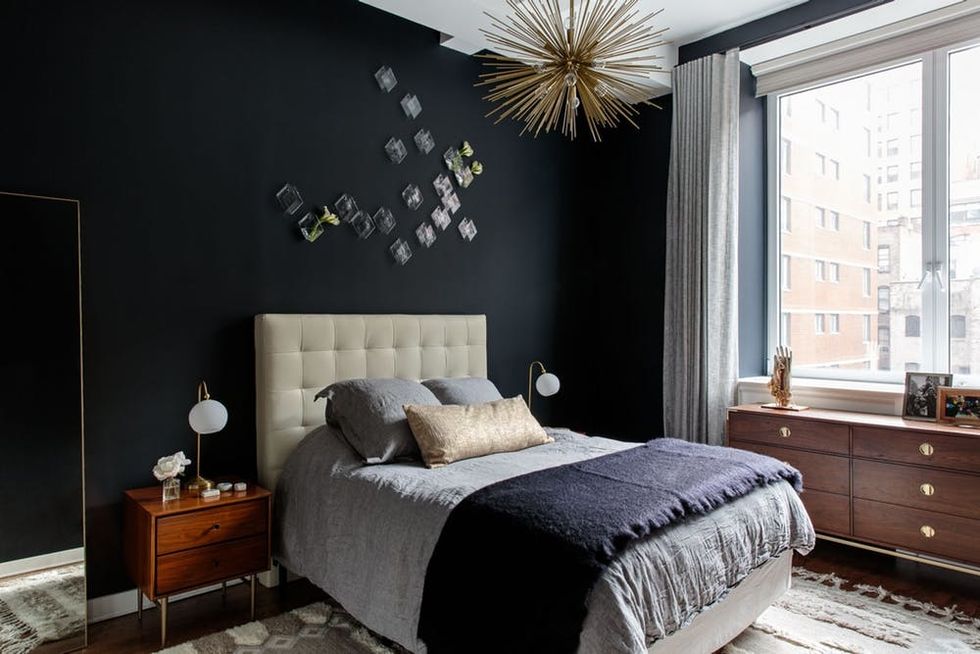 The one place where more subdued shades prevail is the bedroom. Clark opted for a nearly black shade of inky blue to create a calming effect (and we think the decorating risk totally paid off!). “The dark blue hue helps make the room feel more like an escape,” Clark says.