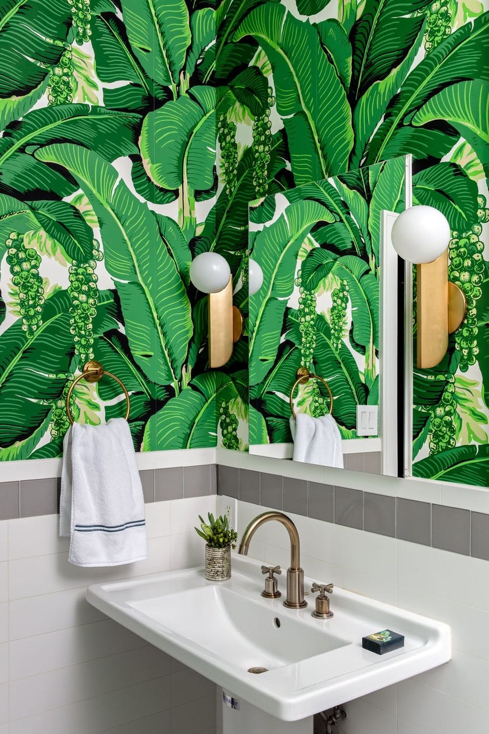Last but certainly not least, the bathroom packs a major pattern punch thanks to this palm-print wallpaper. “Powder rooms are always the most fun area, where clients are more willing to go for the unexpected,” Clark says. Who knew plants had a pop-art side?