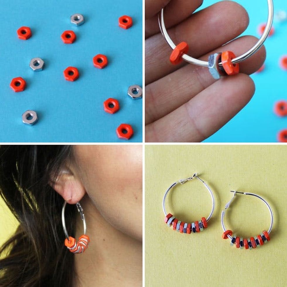 Spray paint a few hex nuts orange and loop them onto your hoops. We went with an orange-silver-orange-silver pattern.