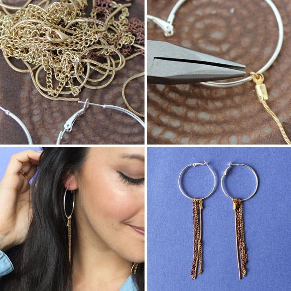 For this one, take lengths of chain and simply string onto your hoops. If your chain is too small to fit on the hoops, add a cord end and then loop on.