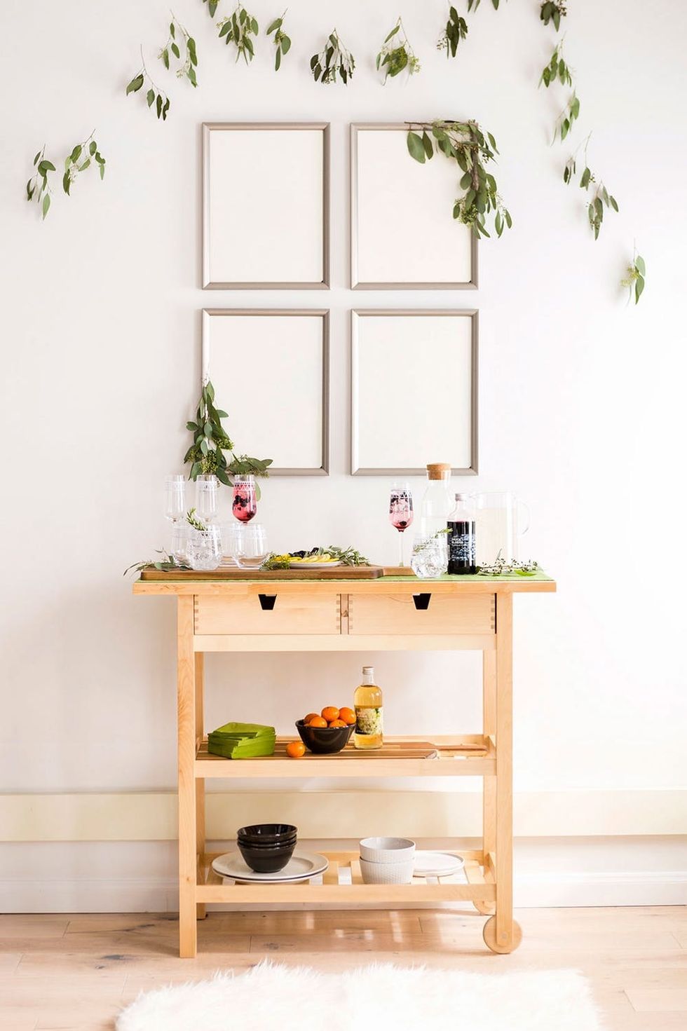 We furnished our bar with a vibrant table runner, then topped that with the SMÅÄTA chopping board (there can and will be spilling, and a wood surface means easy clean-up). We added a few stray garlands to spruce it up — a trick that makes any surface photogenic with next to no effort.