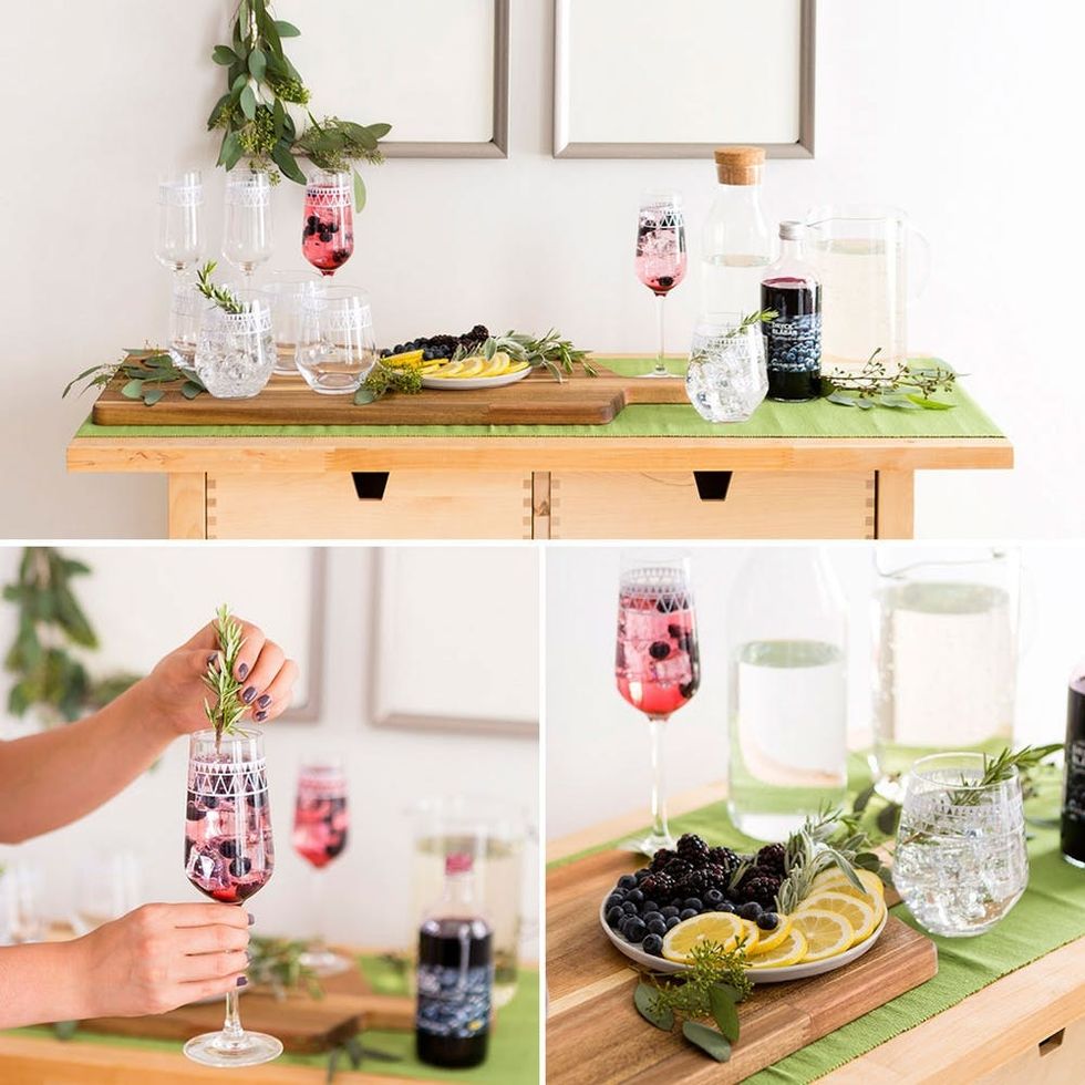 We like to stick to a three-ingredient “house cocktail” that guests can customize to their liking — without feeling overwhelmed. Supply festive glassware (like IKEA® VINTER 2017 Champagne flutes), the ingredients, and a plate of pretty garnishes on a portable cart, such as this FÖRHÖJA kitchen cart. Limit tabletop clutter by housing backup ingredients on the shelves below.