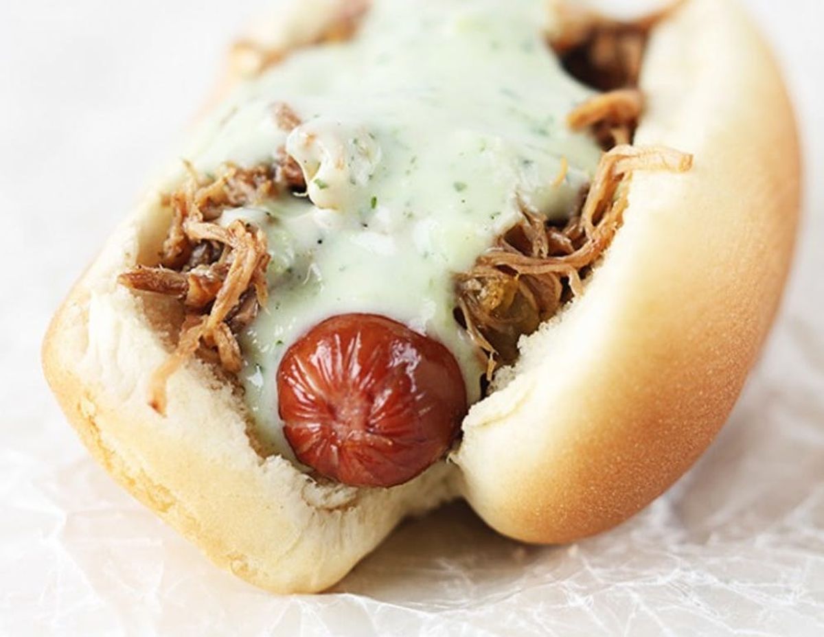 2. Sweet Pork and Tomatillo Hot Dogs: Next time you make pulled pork sandwiches, save some leftovers for these dogs. You’ll love the sweet and savory combo of the shredded pork and dog with a light kick from a homemade tomatillo sauce. (via Creme De La Crumb)