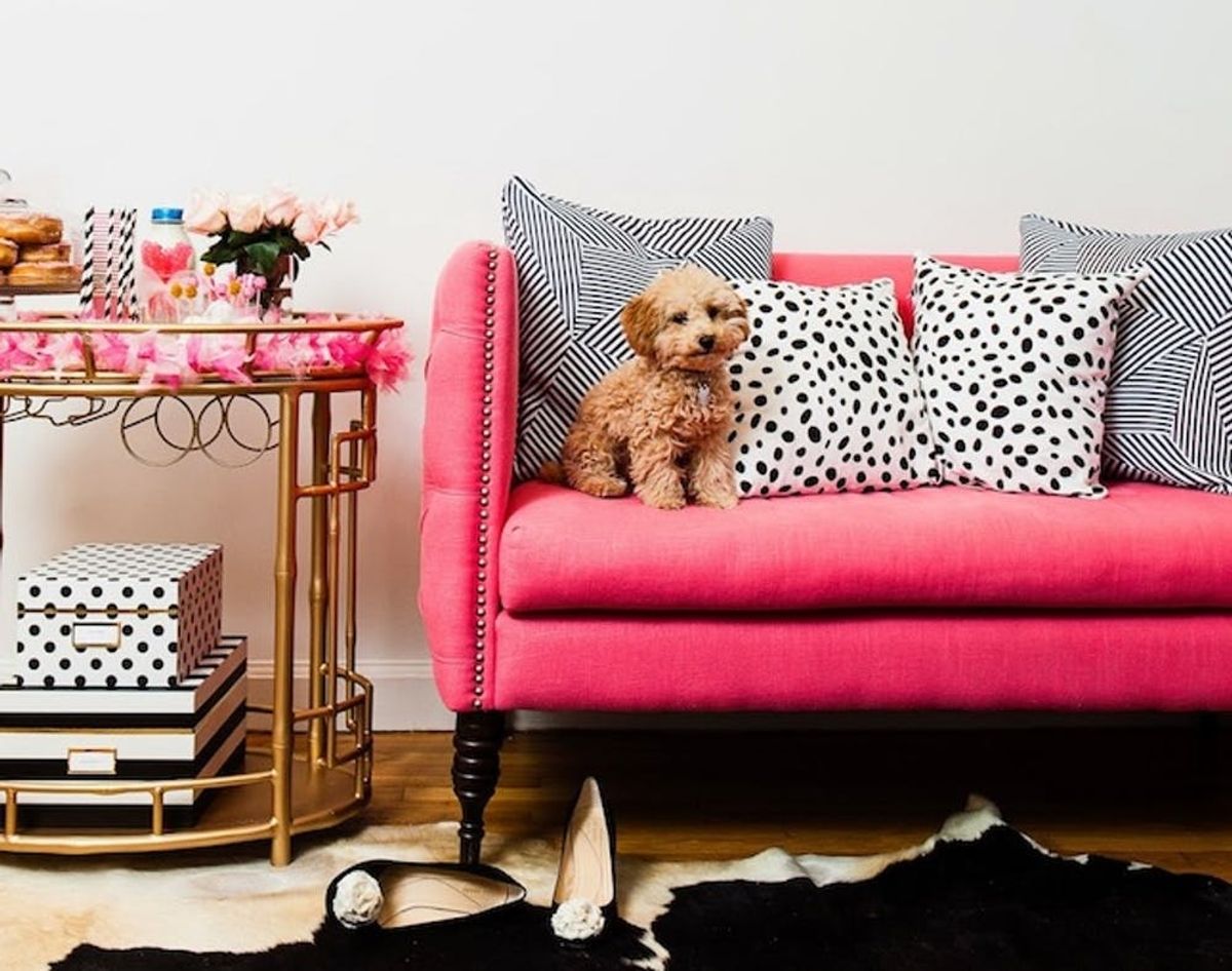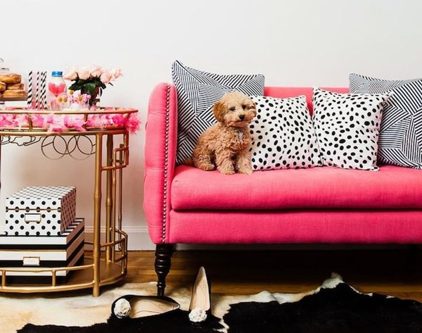 2. Living Room Centerpiece: That dog, that “coffee” sign, that chic bar cart — it’s tough to pick a favorite in this room, but the hot pink sofa is a definite knockout. (via The College Prepster)