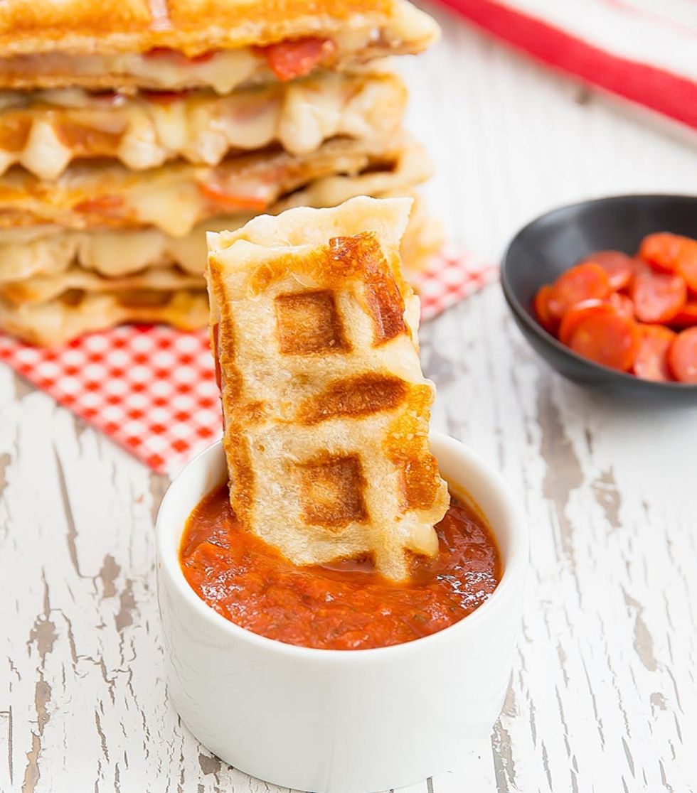12. Waffled Pepperoni Grilled Cheese: Waffle irons turn even boring sandwiches into crispy, golden delights, full of nooks and crannies for scooping up your favorite sauce. Pepperoni pizza grilled cheese takes well to this method, especially when served with marinara for dunking. (via Kirbie Cravings)