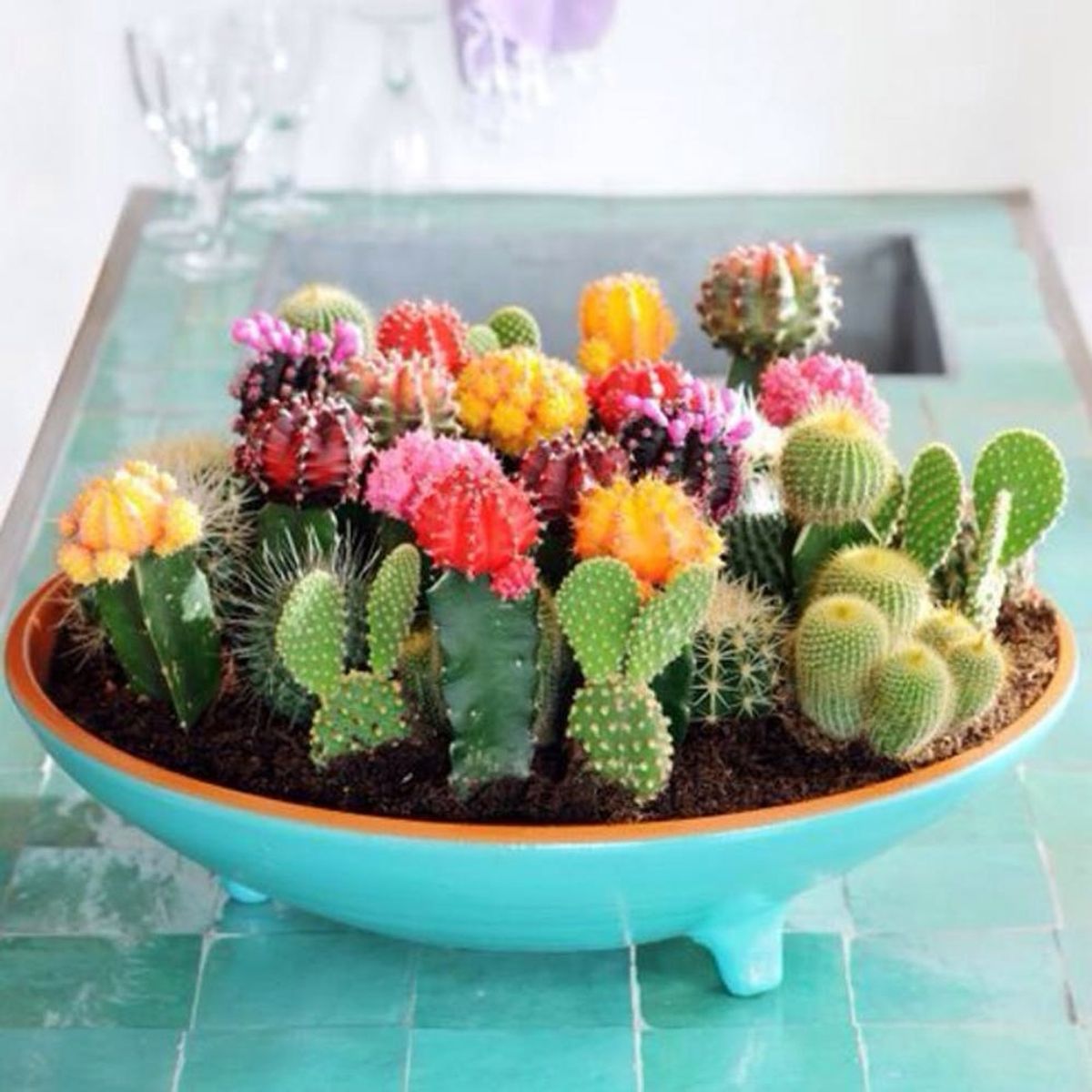 For a simple potted plant refresh, add in an assortment of colorful cacti, like the ruby ball cactus. It creates a fun and dynamic look, especially when clustered together in an oversized planter. (via Craftaholics Anonymous)