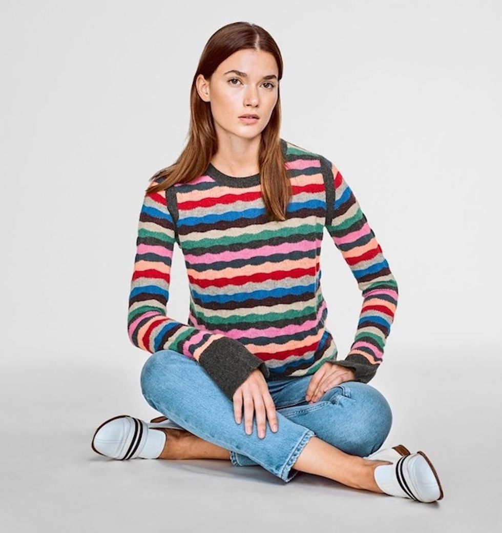 What you’re looking for in this price point is the craftsmanship. “Are the seams tight on the inside of the sweater? When you turn it inside out do the seams look chunky or poorly done? A good cut and sew job will finish seams so they are tight and neat,” Scanlan says. The fabric will likely be medium gauge with fibers that last longer. Morrissey notes, “Make sure the garment is not too lofty or fuzzy, or you will probably have a garment that pills after several wears.” Brit and Co pick: White + Warren Cashmere Wavy Stripe Crewneck ($320)