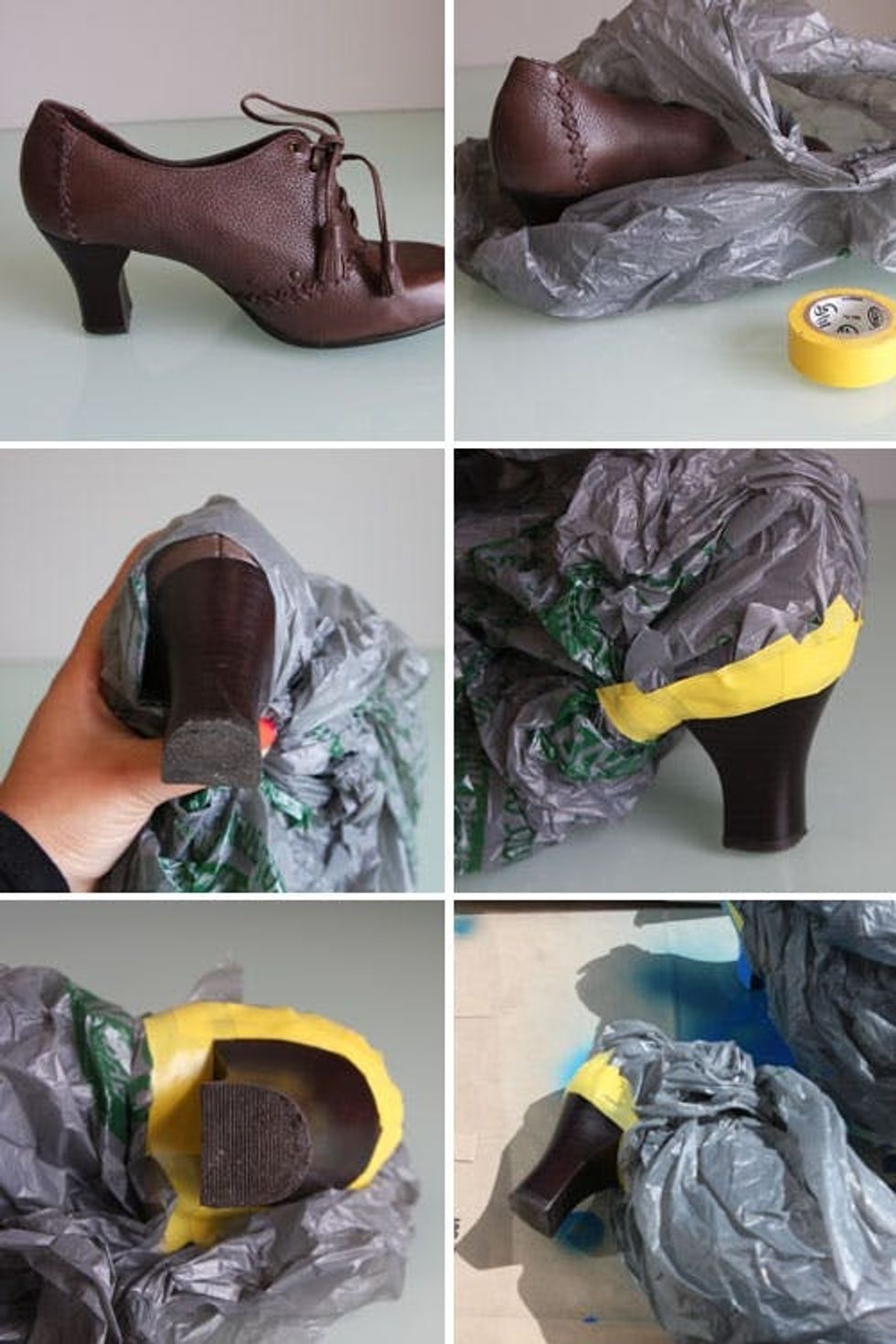 Next, you're going to tape off the part you want to paint. Put most of your shoe in a plastic bag and just let the heel pop out. Use electrical tape (conforms to your shoe better than painter's tape) and attach the bag to your shoe. Be sure to tape at the top edge of the heel firmly.