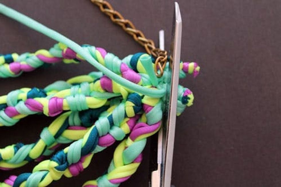 Trim off the ends, and lay out in the way you’ll be putting it together. Use another piece of spandex to weave through the ends of each piece and tie to one end of chain.