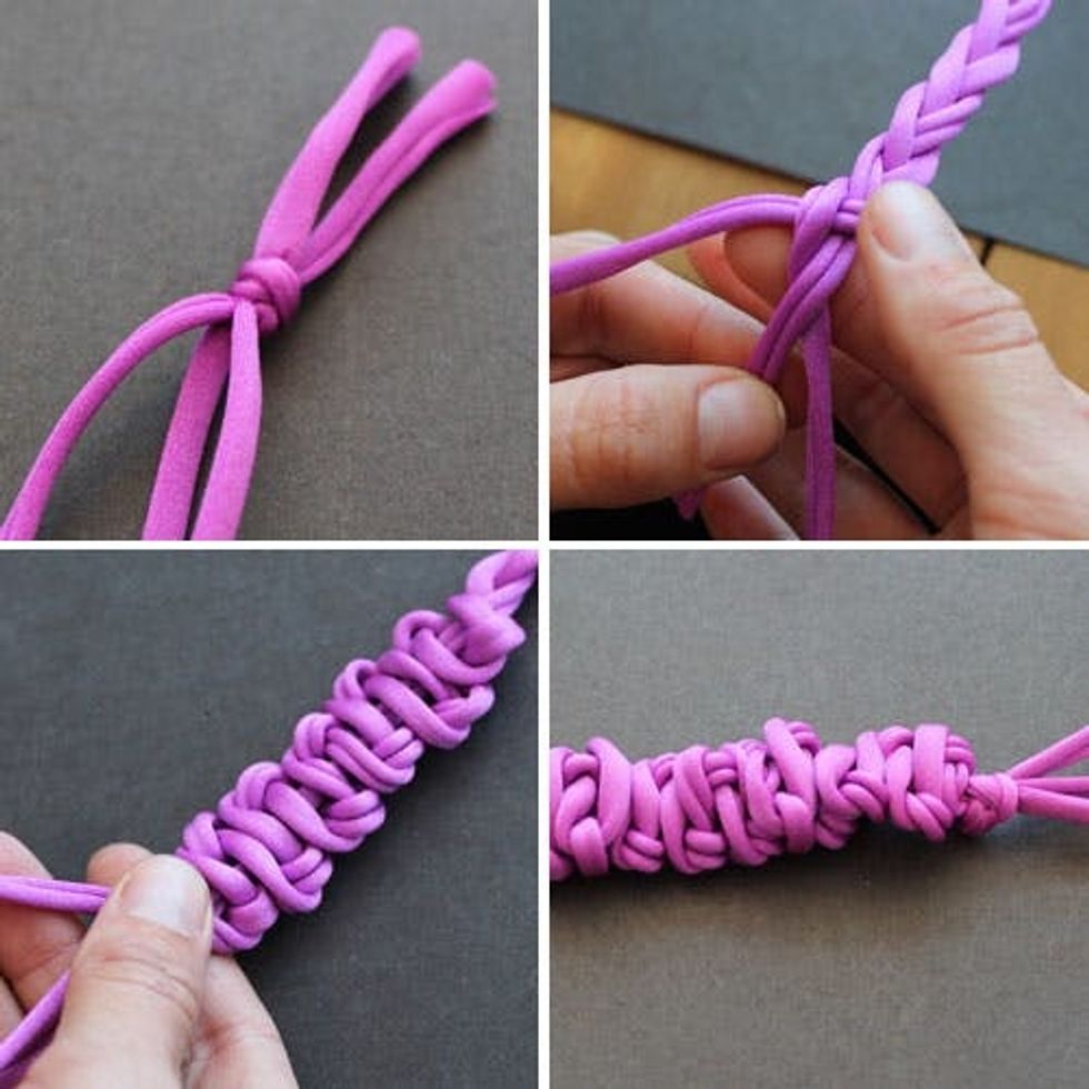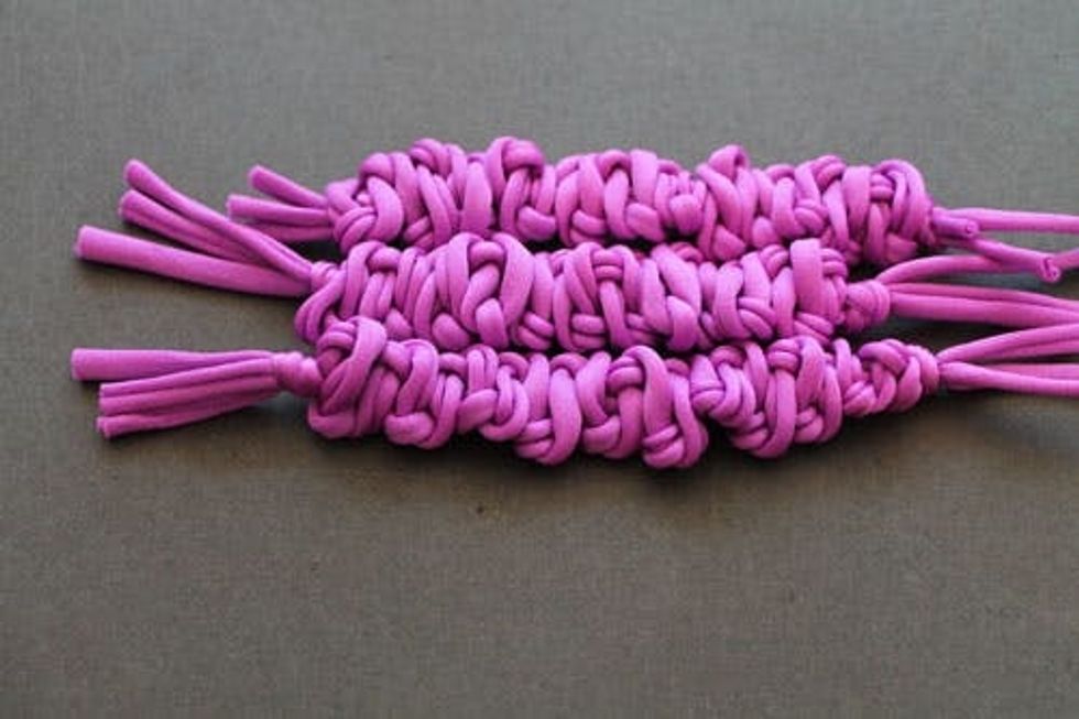To weave together, take two strip sets and use another individual strip to tie them together at the top. With the same strip, go under the right side, through the middle, and over the right side. Now go under the left side, through the middle, and over the right side. Bring it back around and start over. You’ll need to do two of these in between each set of knots. Repeat until you’ve made 3 separate pieces.