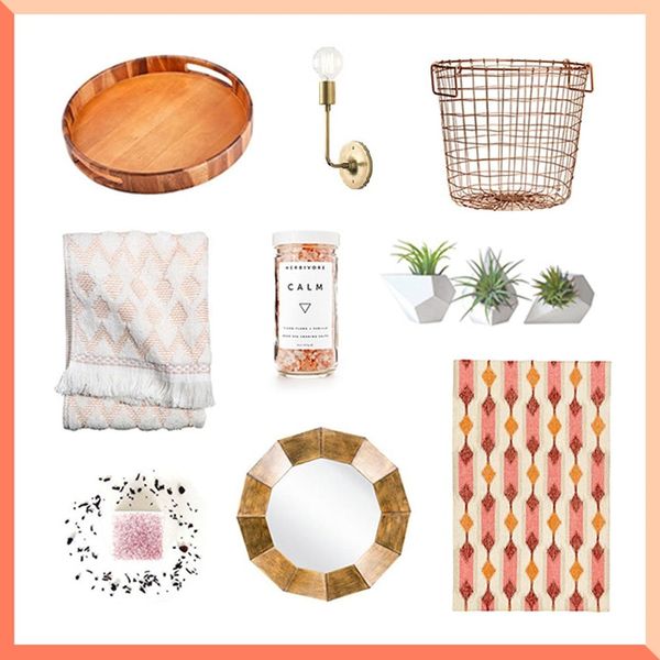 Macy’s Home Design Studio Small Starburst Mirror ($45), Wind & Willow Home Neon Pink Dipped Wooden Candle Holders ($16), H&M Jacquard-Weave Bath Towel ($18), Serena & Lily Teak Step Stool ($128), Nordstrom Johnathan Adler Metallic Porcelain Zebra Dish ($32), Crate and Barrel Olin Black Striped Cotton Dhurrie Rug ($20), Lulu & Georgia Flamingo Laundry Hamper ($58), Dot & Bo Dainty Dots and Chevron Shower Curtain ($92), Vickerey Savon de Marseille Liquid Soap ($21)