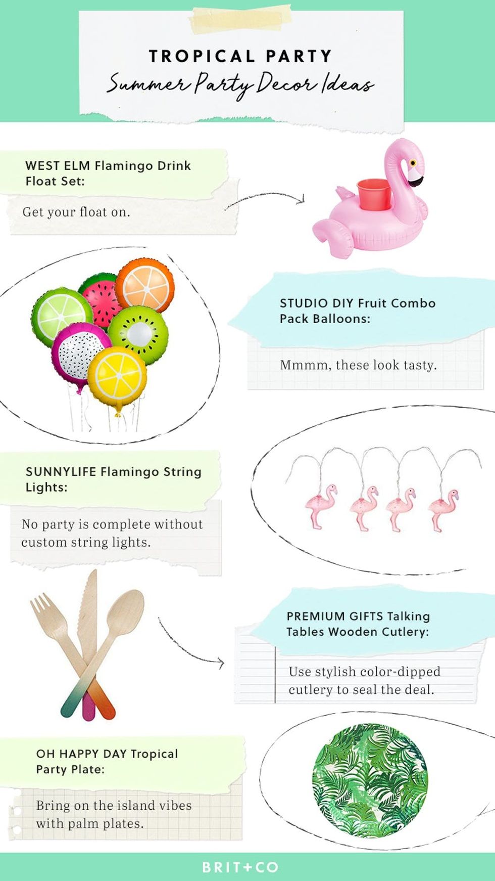 West Elm Flamingo Drink Float Set ($13, set of two), Studio DIY Fruit Combo Pack Balloons ($15, set of six), Sunnylife Flamingo String Lights ($26), Premium Gifts Talking Tables Wooden Cutlery ($27, set of six), Oh Happy Day Tropical Party Plate ($10, set of 12)