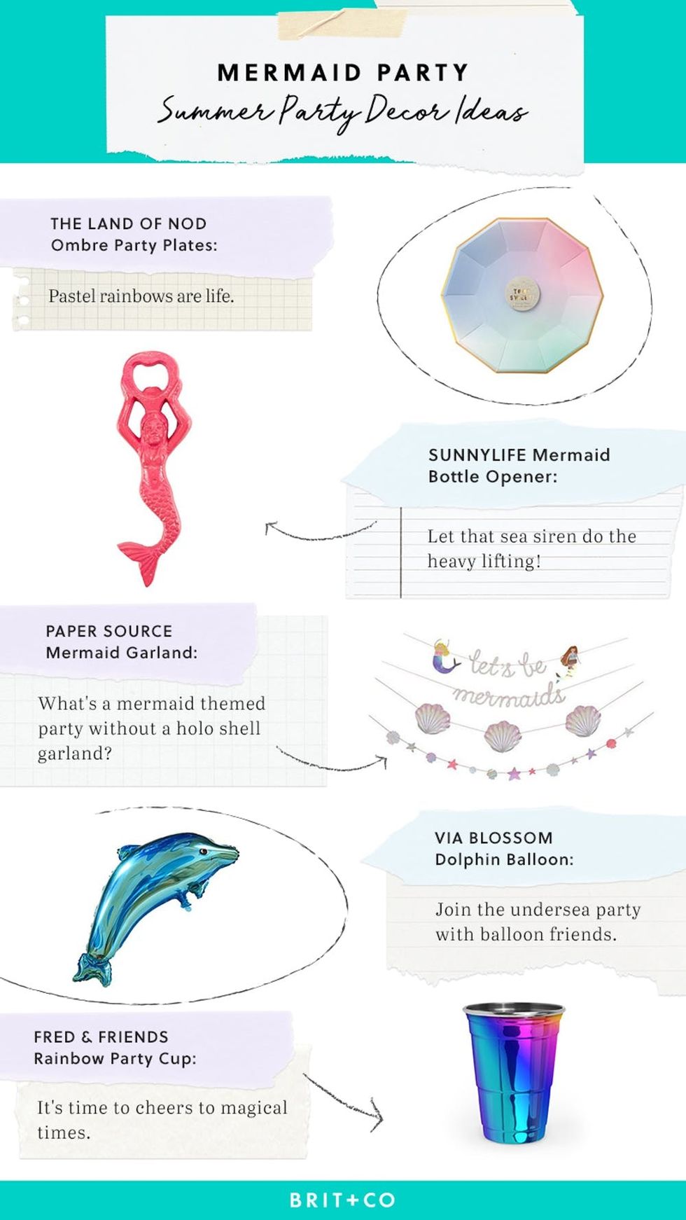 The Land of Nod Ombre Party Plates ($7, set of eight), Sunnylife Mermaid Bottle Opener ($17), Paper Source Mermaid Garland ($14), Via Blossom Dolphin Balloon ($7), Fred & Friends Rainbow Party Cup ($16)