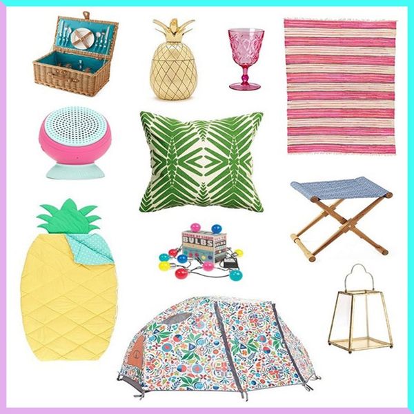 Outdoor Oasis Willow Picnic Basket ($115), The Pineapple Co. Pineapple 2-Piece Small Tumbler ($30), The Glam Camping Co. Acrylic Wine Glasses ($12), eSale Rugs Kilim Dhurrie Rug ($396), Serena & Lily Camp Stool ($295), Poler The Two Man Tent ($262), PBteen Shaped Sleeping Bag ($20+), Swell Speaqua the Barnacle + Quincy Davis Pro Model Speaker ($65), H&M Patterned Cushion Cover ($13), The Glam Camping Co. LED Battery Festoon Lights ($26)