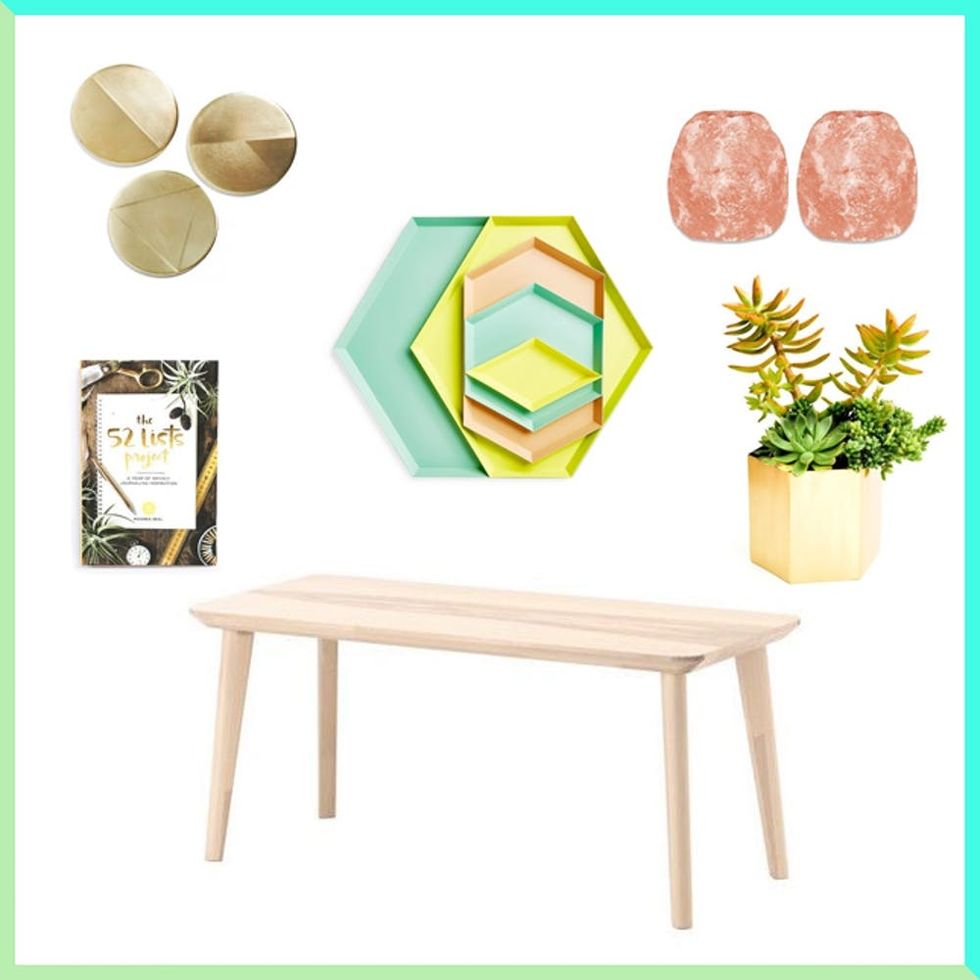 IKEA Lisabo Coffee Table ($129) + AHA Life Brass Coasters ($30), The 52 Lists Project by Moorea Seal ($17), Hay Kaleidoscope Trays ($18-$40), Bed Bath & Beyond Himalayan Crystal Candle Holders ($15), Leif Large Brass Hexagon Planter ($65)