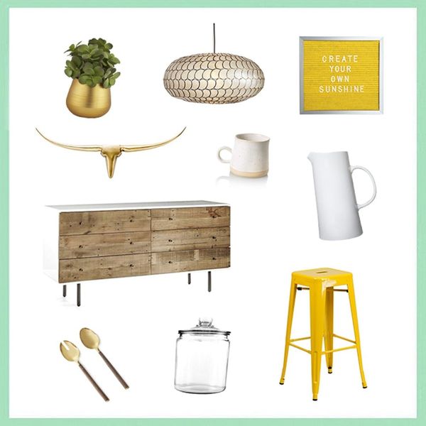 CB2 Potted Eucalyptus Plant ($35), CB2 Luna Capiz Pendant ($329), Three Potato Four Co. Letter Board ($50), Oliver Bonas Aline Mug ($16), Threshold Large Pitcher ($15), Biz Chair High Backless Yellow Metal Indoor-Outdoor Barstool ($35), Anchor Hocking Heritage Jar With Lid ($72), Williams & Sonoma Gold and Wood Servers ($50), West Elm Reclaimed Wood + Lacquer 6-Drawer Dresser ($1399), Moes Home Collection Longhorn Wall Decor ($168)