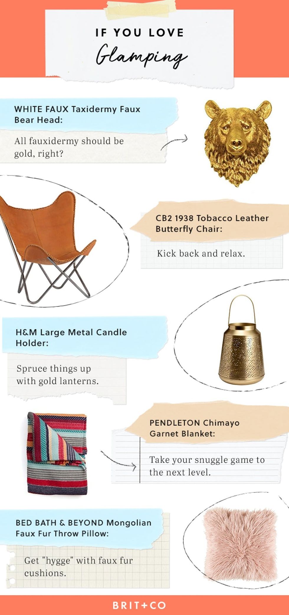 White Faux Taxidermy Faux Bear Head ($108), CB2 1938 Tobacco Leather Butterfly Chair ($399), H&M Large Metal Candle Holder ($25), Pendleton Chimayo Garnet Blanket ($199+), Bed Bath & Beyond Mongolian Faux Fur Throw Pillow ($20),
