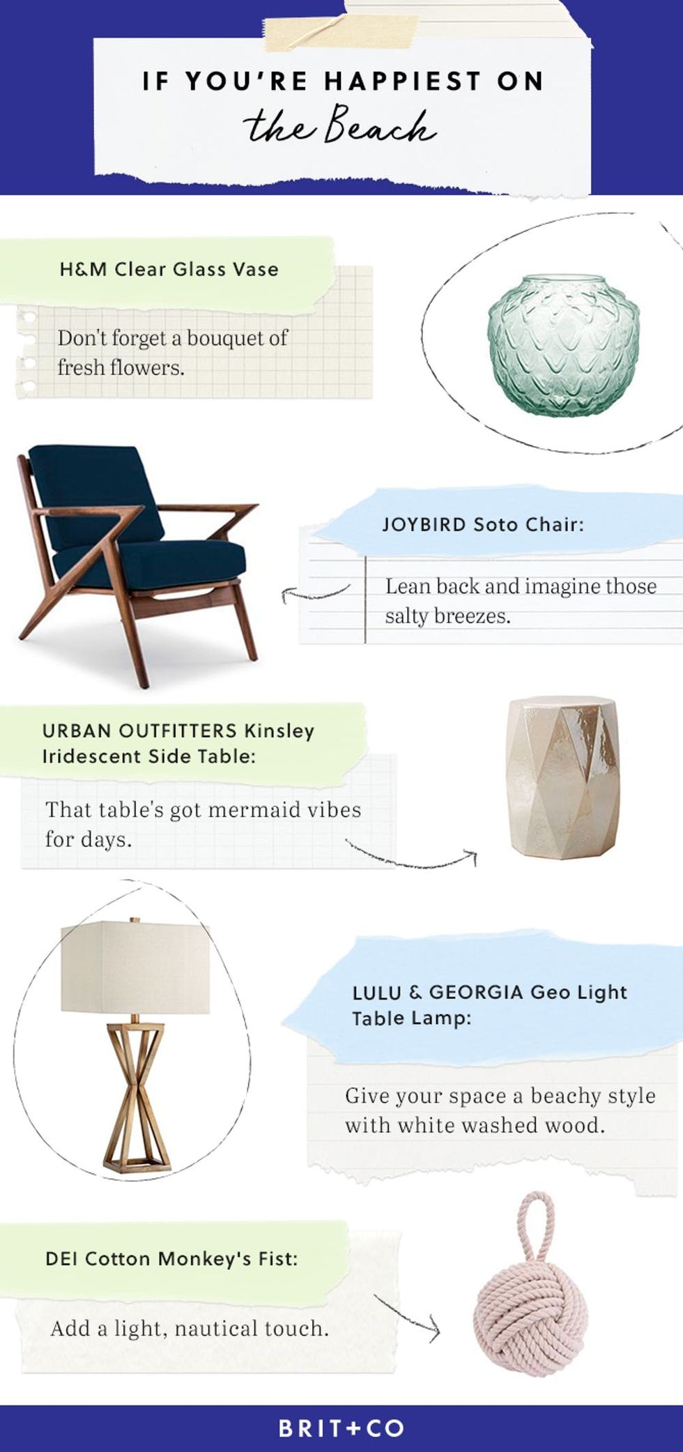 Urban Outfitters Kinsley Iridescent Side Table ($129), H&M Clear Glass Vase ($13), Joybird Soto Chair ($799), Lulu & Georgia Geo Light Table Lamp ($187), DEI Cotton Monkey’s Fist ($22), PBteen The Emily & Meritt Gold Anchor Pillow ($39)