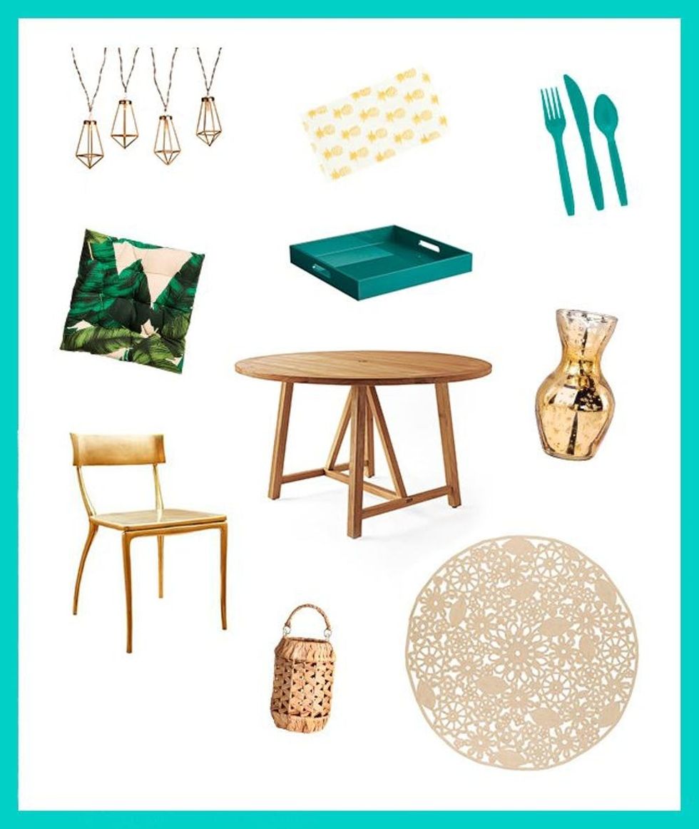 Ooga Lights Battery Powered Gold Wire Diamond LED Lights ($15), Oh Happy Day Pineapple Napkins ($10, set of 16), Cheeky Turquoise Disposable Cutlery ($3), Luna Bazaar Gold Adelaide Mercury Glass Bud Vase ($8), Lulu & Georgia Frilancy Indoor/Outdoor Rug ($98+), H&M Candle Lantern ($18), CB2 Midas Gold Dining Chair ($299), H&M Cotton Seat Cushion ($13), Serena & Lily Crosby Teak Round Dining Table ($1498), CB2 Hi-Gloss Square Blue Green Tray ($30)