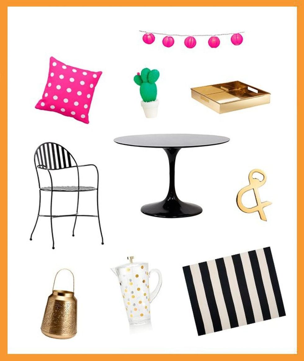Zazzle Hot Pink Polka Dot Pattern Throw Pillow ($30), Sunnylife Round Cactus Candle ($35), Target Electric String Light Round Paper Lanterns ($24), CB2 Bento Coffee Table Tray ($70), LexMod Lippa Fiberglass Dining Table ($965), H&M Bottle Opener ($10), Safavieh Hand-Woven Montauk Black/White Cotton Rug ($198), Kate Spade New York Raise a Glass Acrylic Pitcher ($52), H&M Large Metal Candle Holder ($25), CB2 Swoop Black Outdoor Chair ($269)