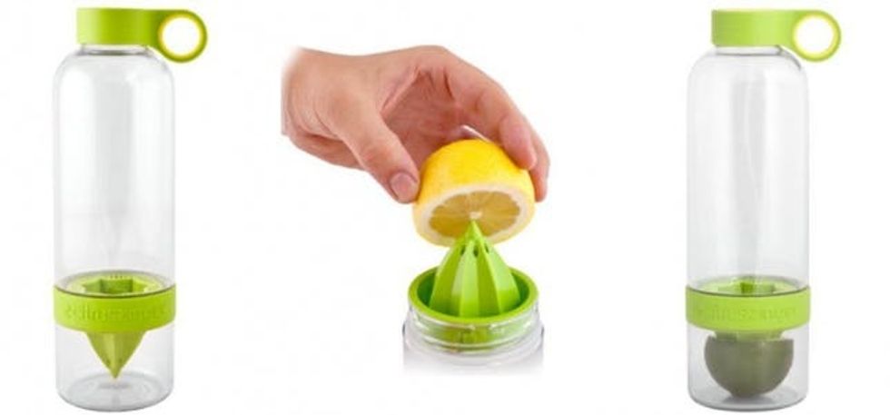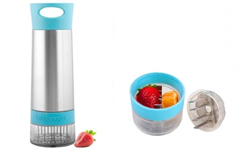 The Aqua Zinger works by subtly infusing water with any flavor combos you add. Try adding fruits like kiwi, blackberries, or cucumber — or any mixture of your favorites! Then just twist the bottom grinder and watch as your flavors are infused into the mix. The bottle is stainless steel to keep your water cold or hot — your coice. You can typically refill it once or twice before adding more fruit.