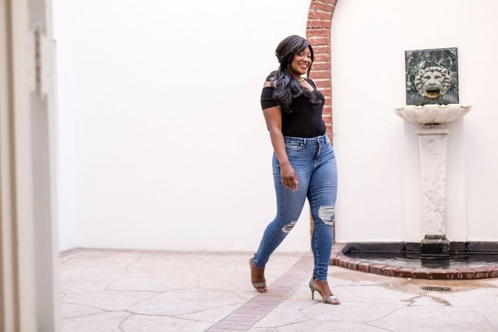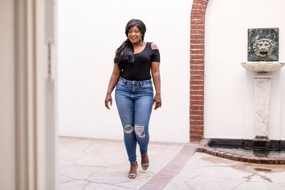 Don’t for one second think that you have to stick to one silo to flatter your figure. Anything from bootcut to boyfriend and trouser-cut styles can offer the look you’re after. Look for styles that incorporate stretch and support in strategic places so you can feel cool, calm, and collected at all times. Consider these Good American Good Waist Raw Stragger ($179), modeled by Natasha. Their ultra high-rise, gap-proof waistband ensures a close fit to accentuate your curves. Tall and curvy? Try a skinny. Short and stacked? Cropped cuts with distressed details could be your answer. You do you.