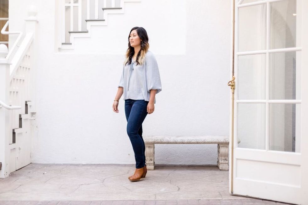 Shorter torsos, inseams, and more narrow leg widths are all factors to keep in mind. According to Joe Dahan, Founder and Creative Director of Joe’s Jeans, “Never compromise on the placement of the back pockets. That’s what makes the jeans look like they’re made for you. ” Look for them just below the yoke of your jeans to ensure short girl magic. Take, for example, this BDG Twig Mid-Rise Skinny Jean ($69) on Alonna. The pockets don’t dip too far beyond her backside — a detail that adds proportion to her small frame.