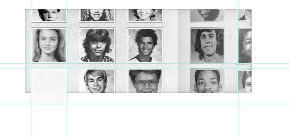 2. Use the layers panel to customize the yearbook photos – try adding photos of your friends or family by opening up images of them in Photoshop, cropping, converting to Grayscale (Image > Grayscale), changing the backgrounds to white or gray and then inserting over each yearbook image square.