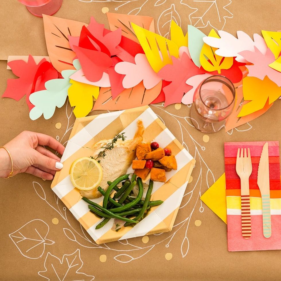 Let’s be honest — hosting an event can be a scary experience for your wallet. There’s the cost of the food, decor, servingware, and maybe even extra tables and chairs. Here at Brit + Co, we’ve hosted many Friendsgivings over the years. From college dorm rooms, to one-bedroom apartments, to houses, we’ve squeezed our friends into all types of places. The key to a successful, low-cost Friendsgiving is keeping it potluck-style and taking advantage of discount stores and paper products to create decor. Follow along below to learn how to create paper decor that will dress up your space (on a budget) for one of the best holidays of the year: Friendsgiving.
