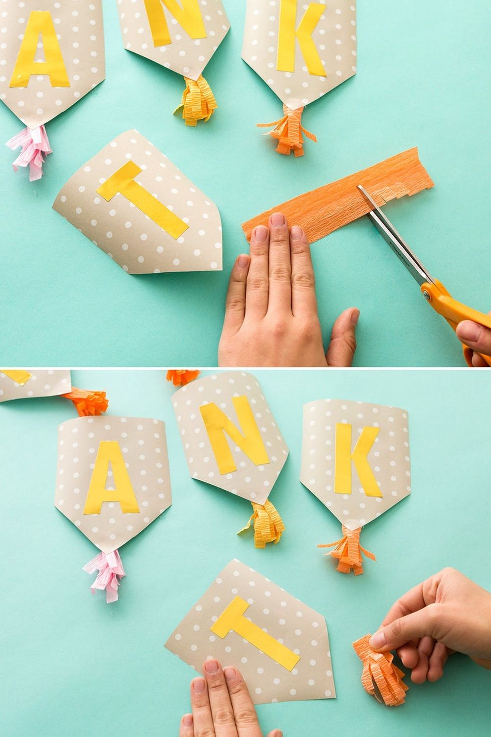 Cut small pieces of streamer and fringe the bottom. Roll up to create a tassel and hot glue onto the bottom point of each letter in the banner.