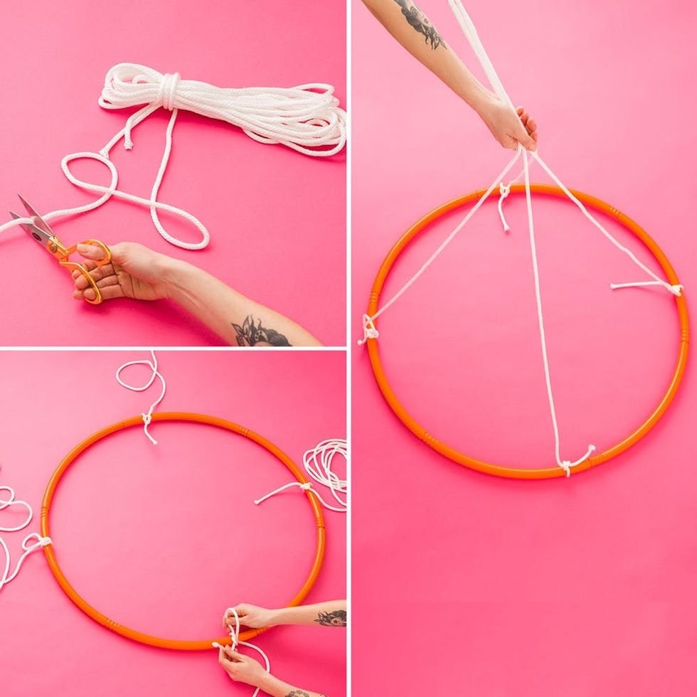 Begin by cutting four equal pieces of rope. The length of this depends on your ceiling height and how long the curtains are that you will be using. Measure and cut accordingly. Next, attach the ropes equal distance apart from each other on the hula hoop.