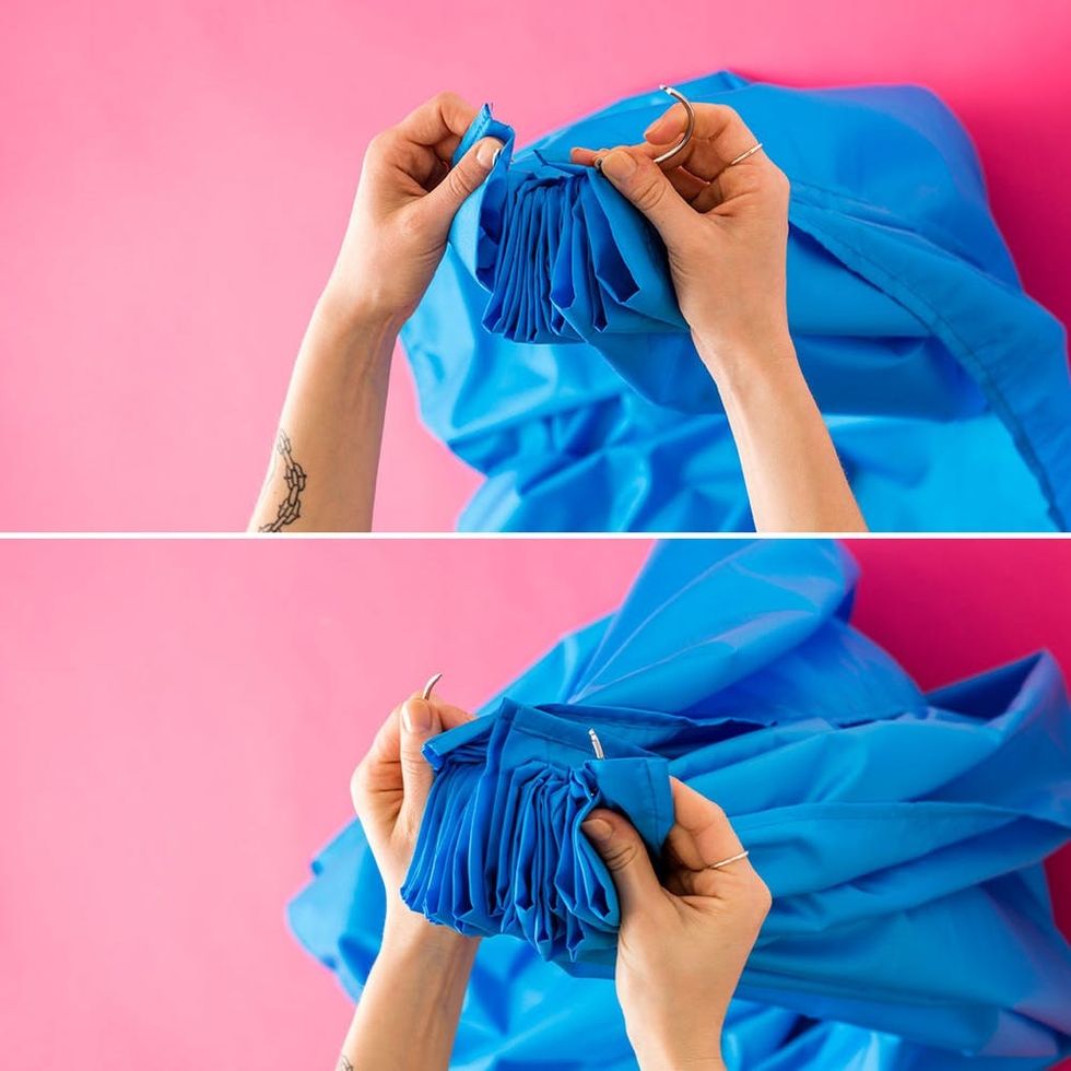 Attach the curtains to each side of the large hook. Both shower or regular curtains will work for this DIY, as long as they have holes for the ring.