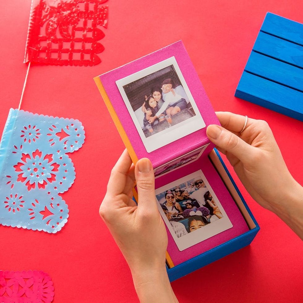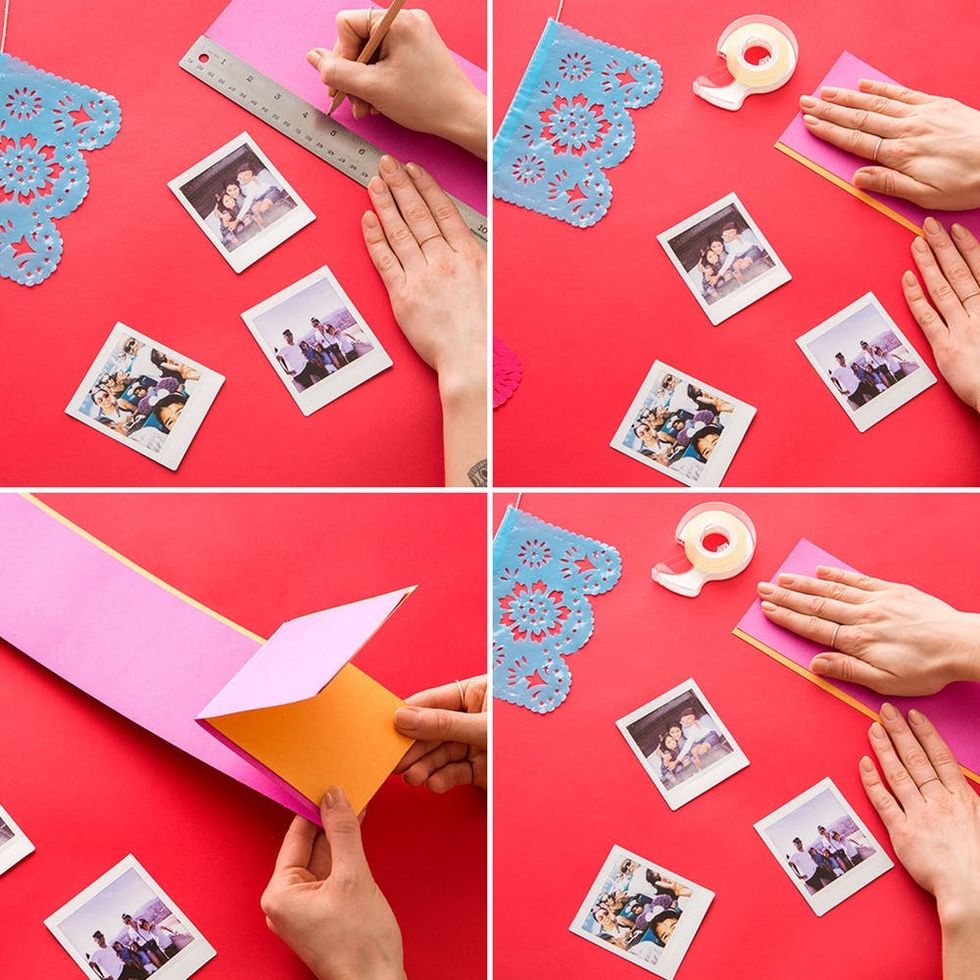 While paint dries, measure about equal increments vertically on your cardstock. We measured about 4 ½ inches to fit our photos, but this may differ depending on the size of your prints. To add some extra color, we used double-stick tape to attach orange and pink cardstock. Next, fold the cardstock accordian style, along your measured marks. Lastly, attach your prints with double-stick tape.