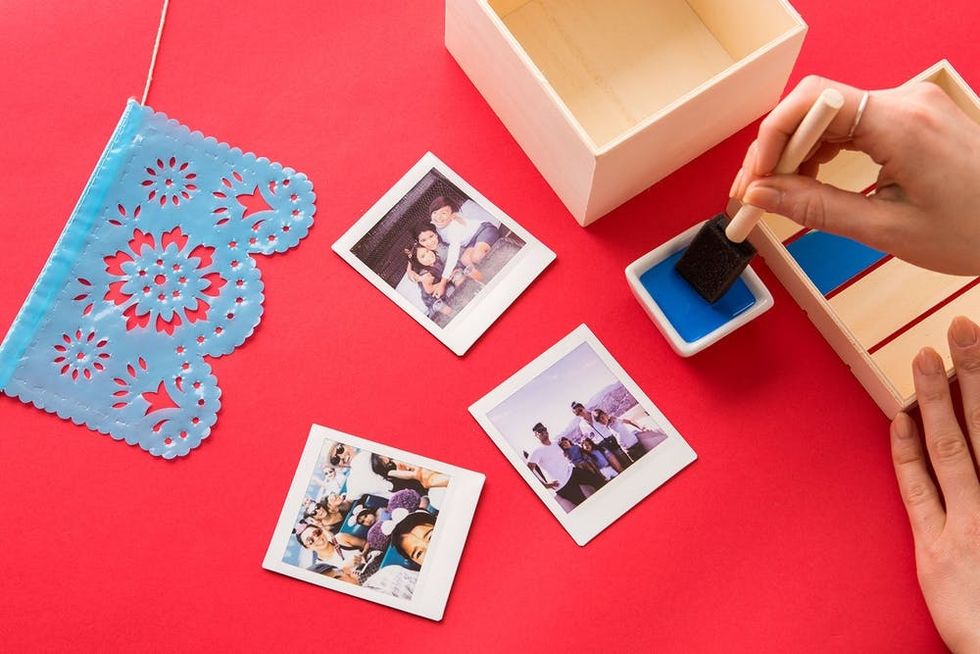 Begin by painting the wooden box; you can choose any color your heart desires. We chose to stick to a color palette inspired by the movie's colorful logo.