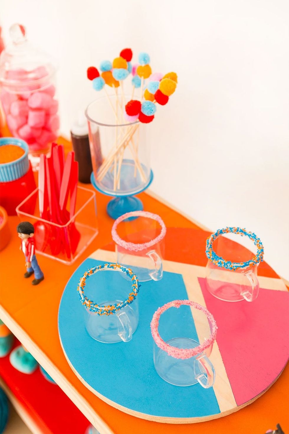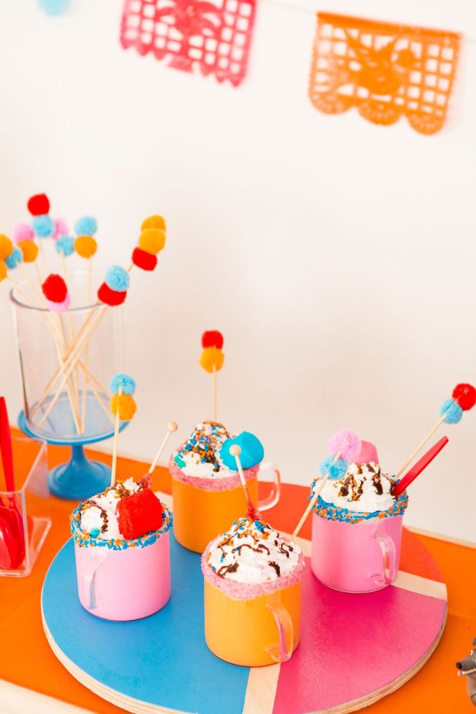 To make the pom-pom stir sticks, just hot glue pom-poms to skewers.