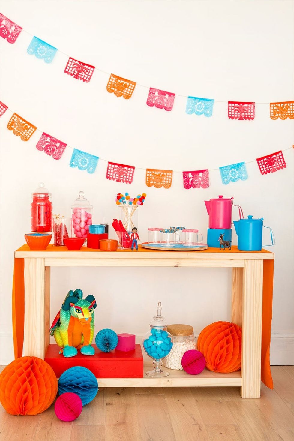 For our hot “Coco" bar we went with two different colors of hot cocoa served in hot beverage pitchers, sprinkle covered mugs, DIY pom-pom stir sticks, and toppings galore. We also added the cutest character figurines and plush toys. Look how beautiful Pepita is!