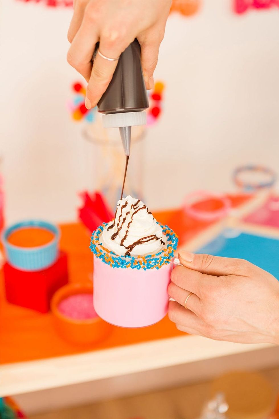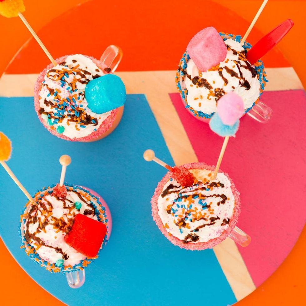 To make these sprinkle mugs, melt white chocolate in the microwave and dip the tops of the mugs. Next dip the chocolate covered mugs in sprinkles. Give them some time to cool off and dry before serving.
