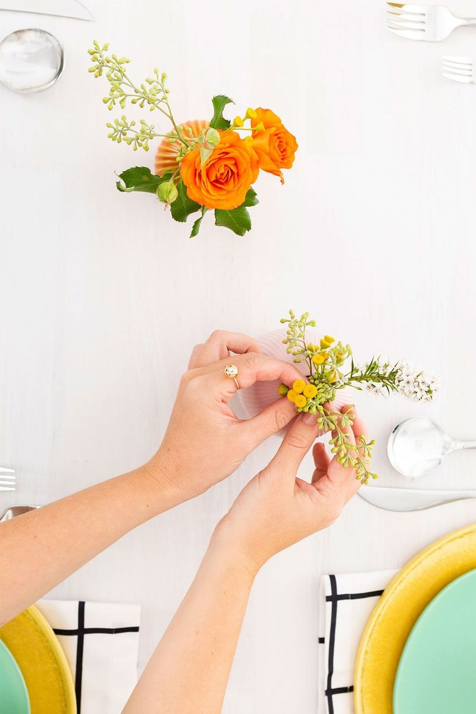 3. Get a few small arrangements out of a big bouquet for maximum impact. Ready to be a total dinner party rebel? Skip the traditional centerpiece and opt for a few small arrangements instead. You’ll leave room for more delicious dishes on the table and allow each guest to appreciate the decor no matter where they sit. Most importantly, no one will have to crane their neck to see the person across from them!