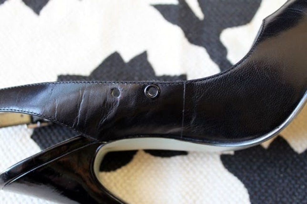 We’ll start with a pair of sling backs we turned into a ballet-inspired Mary Janes. We recommend slipping your shoes on before you punch anything. Mark the spots for holes with a pen.