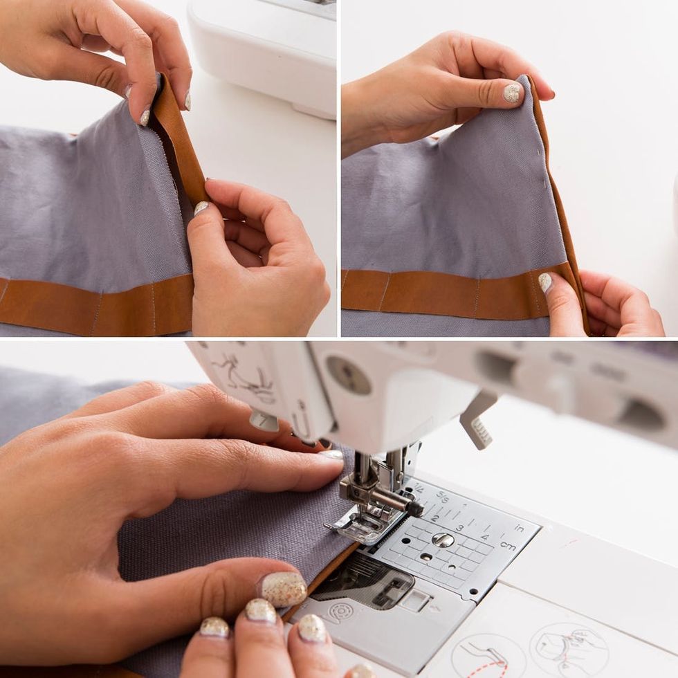 3. Pin the strip of leather to the top center part of the canvas. Then alternate pins every 3 to 1 inch until you’ve reached the bottom of the leather strip. Using the sewing machine, sew where you have marked your pins.